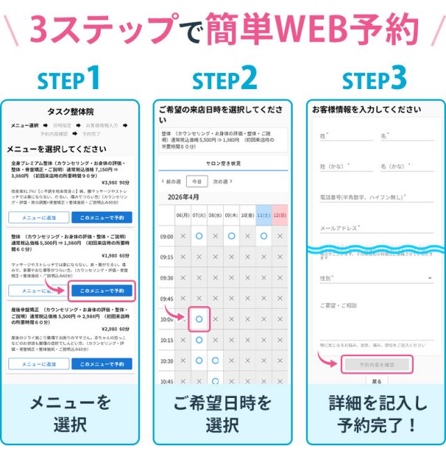 タスク鍼灸接骨院・整体院 浜北店では、WEBからのご予約・お問合せも可能です。